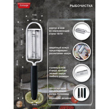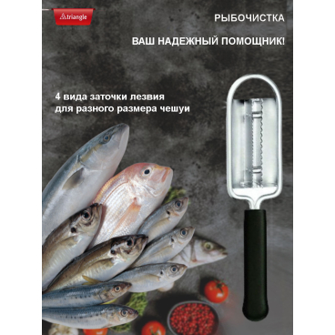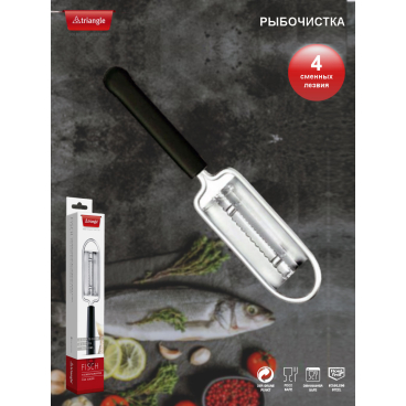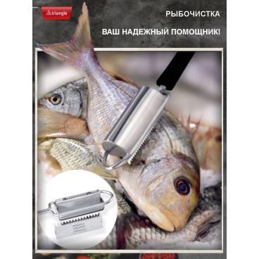 При чистке рыбы, в зависимости от типа и размера чешуи, можно использовать одно из четырёх лезвий универсальной рыбочистки TRIANGLE (Германия): гладкое или волнообразное, мелко- или крупнозубчатое. Защитный кожух гарантирует чистоту, а нескользкая эргономичная рукоятка очень удобно ложится в ладонь. При очистке рыбы не обойтись без пинцета. Рыбный пинцет от TRIANGLE подходит для удаления крупных и мелких косточек.