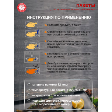 Пакеты для запекания специального размера (25х55 см) с жаропрочными клипсами. Пакет специального размера - узкий и длинный, идеально подходит для запекания рыбы, овощей, гудинок, ребрышек.