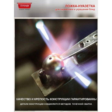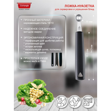 Инструмент качественный и очень прочный, надежно ведёт себя в работе даже с очень жёсткими овощами, т.к. крепление выемки к ручке сделано методом точечной сварки. Удобная рукоятка не скользит в руке во время работы. В выемке предусмотрена перфорация, чтобы вырезанный шарик не прилипал к инструменту и легко извлекался.