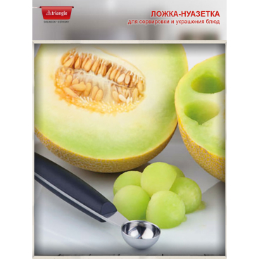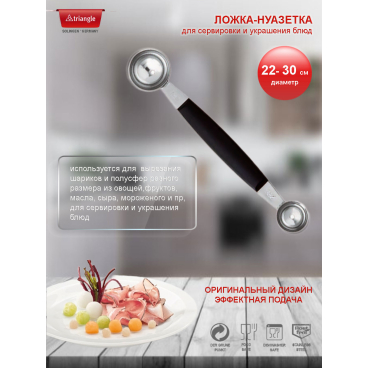 Инструмент прочный, надежный в работе даже с очень жесткими овощами, т.к. крепление выемок к ручке сделано методом точечной сварки. Удобная рукоятка не скользит в руке во время работы. В выемках предусмотрена перфорация, чтобы получившийся шарик не прилипал к инструменту и легко отделялся.