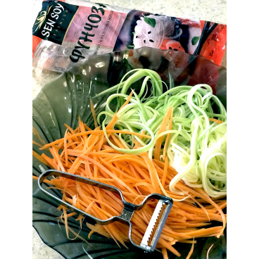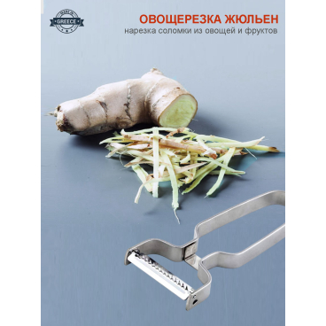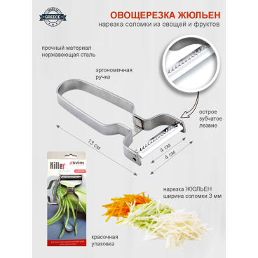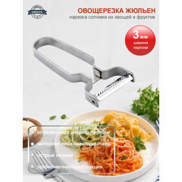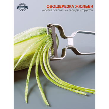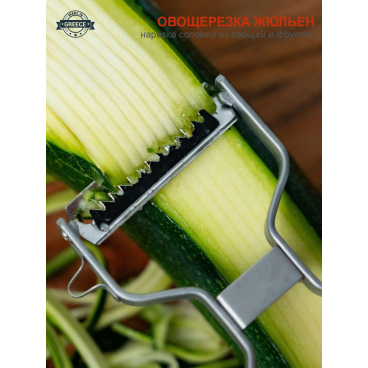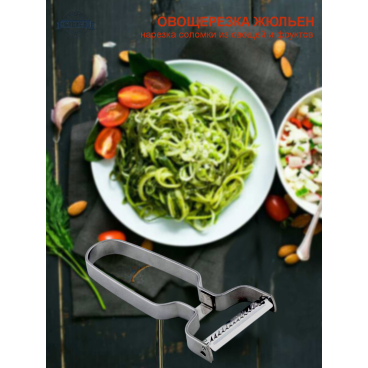 Овощерезка «Нож-жюльен» быстро и красиво нарежет твёрдые овощи и фрукты тонкой соломкой, поможет приготовить «овощные спагетти» для салатов и гарниров.